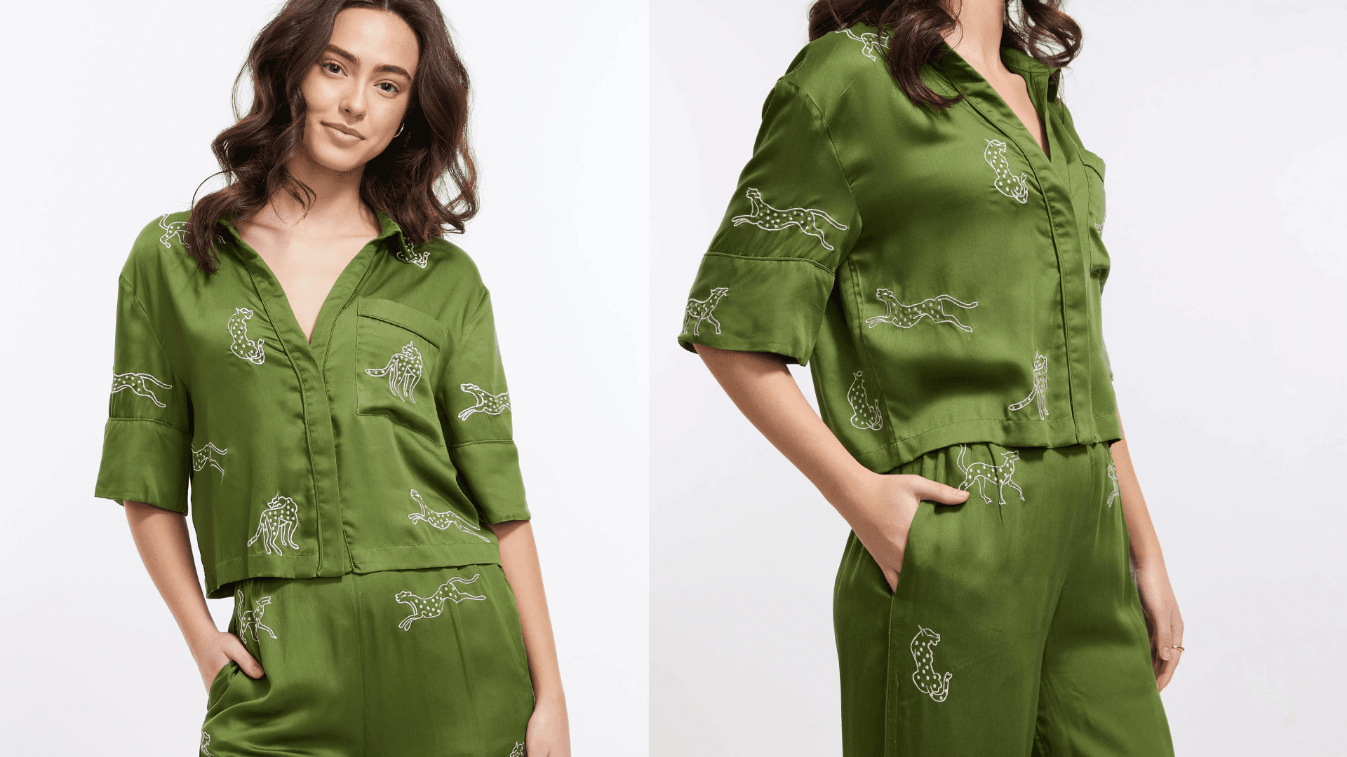 This set from Sani is made of a silk-like material that’s washable. I love its bright chartreuse color and leopard motif. It’s ideal for days where you want to wear something that’s dressier, but still cozy enough. I’d argue you could wear this to a dinner party and no one would care. ($140, Sani)