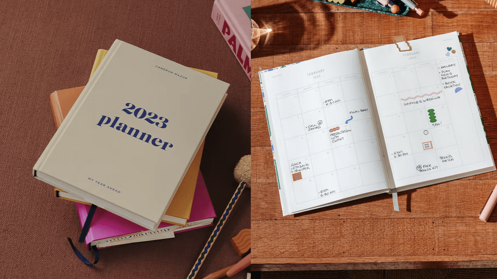 This classic option from Papier has everything you need to stay on top of your day. It has yearly and monthly views for 2023 and guided pages so you can set any important goals, dates, and tasks for the month. Your notes will stay protected thanks to its hard cover and thick, high-quality paper. Pick your colorway, add your name, and get this planning party started. ($25.60, Papier)