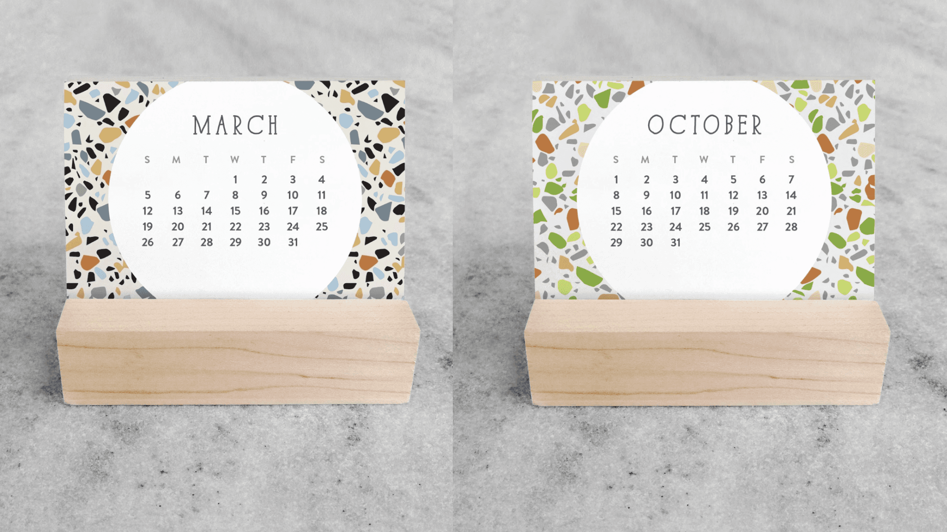This handmade option is covered in trendy terrazzo-inspired prints. Each monthly card is made of sturdy cardstock. Plus, it comes with a maple wood stand — but if you already have a stand you know and love you can opt to just purchase the cards. Coming in at 3.5 inches by 2.5 inches, it’s equally as practical for small spaces as it is cute. ($10+, FavoriteStory via Etsy)