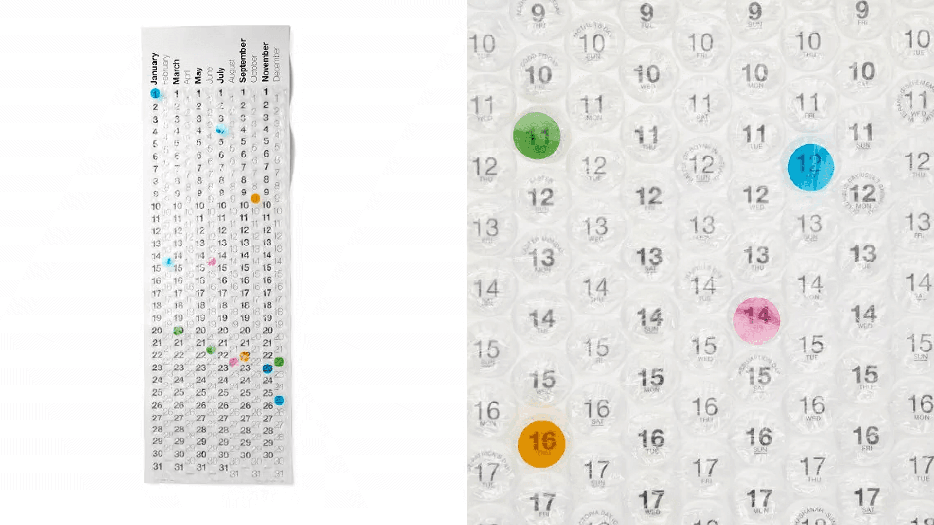 What’s more satisfying than Bubble Wrap? A calendar covered in it. This poster-sized one lets you pop through an entire year. That’s right…365 bubbles. And even though we’re not really thinking about practicality here, significant holidays and days of the week are marked for easy reference. Let’s get popping. ($25, Uncommon Goods)