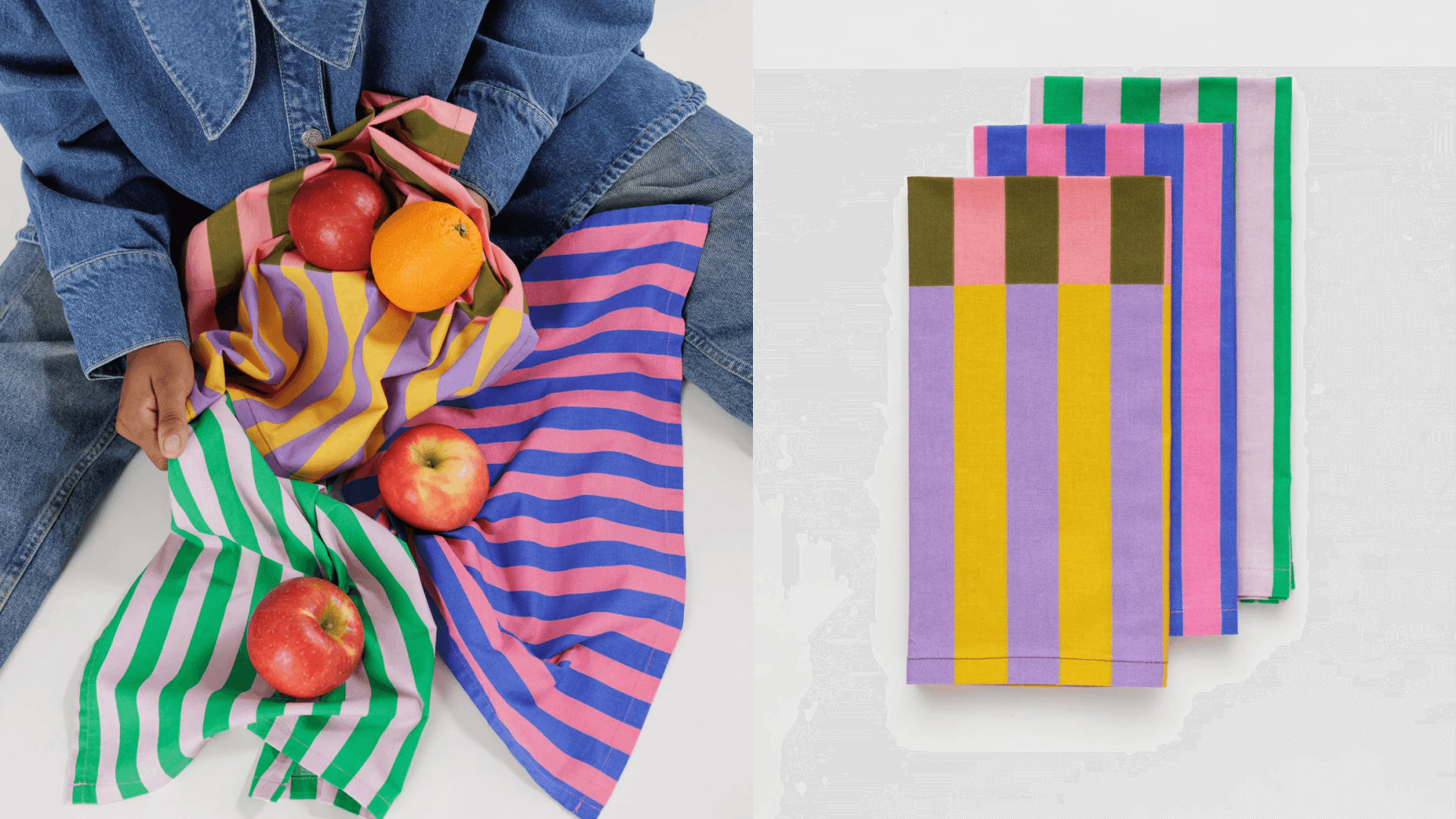 For napkins, hand towels, dish rags, you name it. This set from Baggu is made of 100% cotton and you can use them however you like. Pick from awning stripes, smiley faces, or pastel gingham. Hang them on your oven or dishwasher for a quick statement. ($28/3 pack, Baggu)