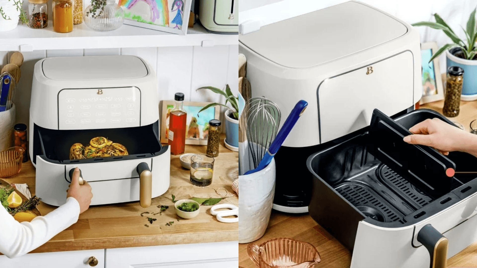 She can cook two different dishes at the same time with this air fryer from Drew Barrymore’s homeware line. It can air fry, roast, dehydrate, bake, and broil a plethora of dishes up to 450 degrees – which means it can really do it all. Depending on her cooking preferences, she can also remove the center divider to cook one full meal at once. The inner baskets, dividers, and nonstick crisping trays are all dishwasher-safe, but we love these liners for easy cleaning. Pick from six chic color options all with gold accents. ($139, Walmart)