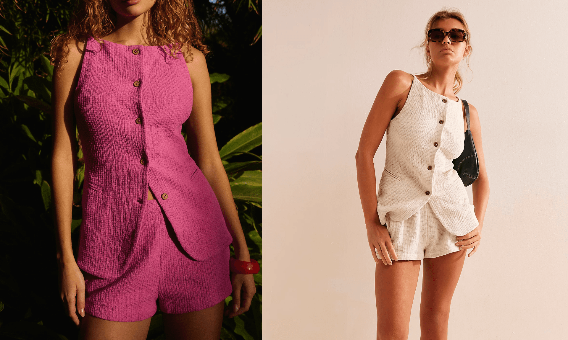Think of this set as a breezy sundress, only with shorts. The fresh linen material will keep you cool on even the hottest of days. They’re high-rise and pleated, while the matching buttoned top hits just above the seam for additional airflow. But don’t worry, you’ll still feel like you have full coverage. Add your favorite clutch and bold earrings to finish the look. ($90+, Banana Republic)