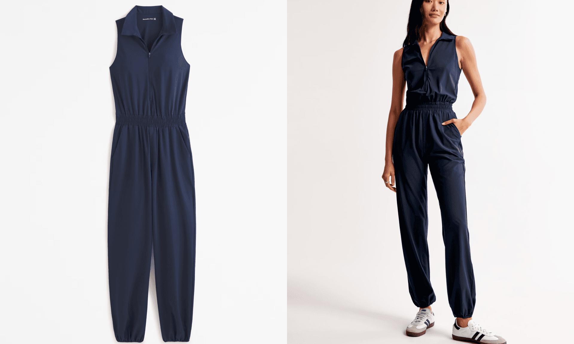 This collared jumpsuit is our go-to for a number of reasons. It has a comfy knit fabric, stretchy elastic waistband, pockets, and a classic collar that gives business on top, but comfort….everywhere else. It has a front zipper on the bodice, so you can adjust the coverage to your liking. It’s available in sizes XXS-XL, and in petite, regular, or tall lengths. ($90, Abercrombie & Fitch)