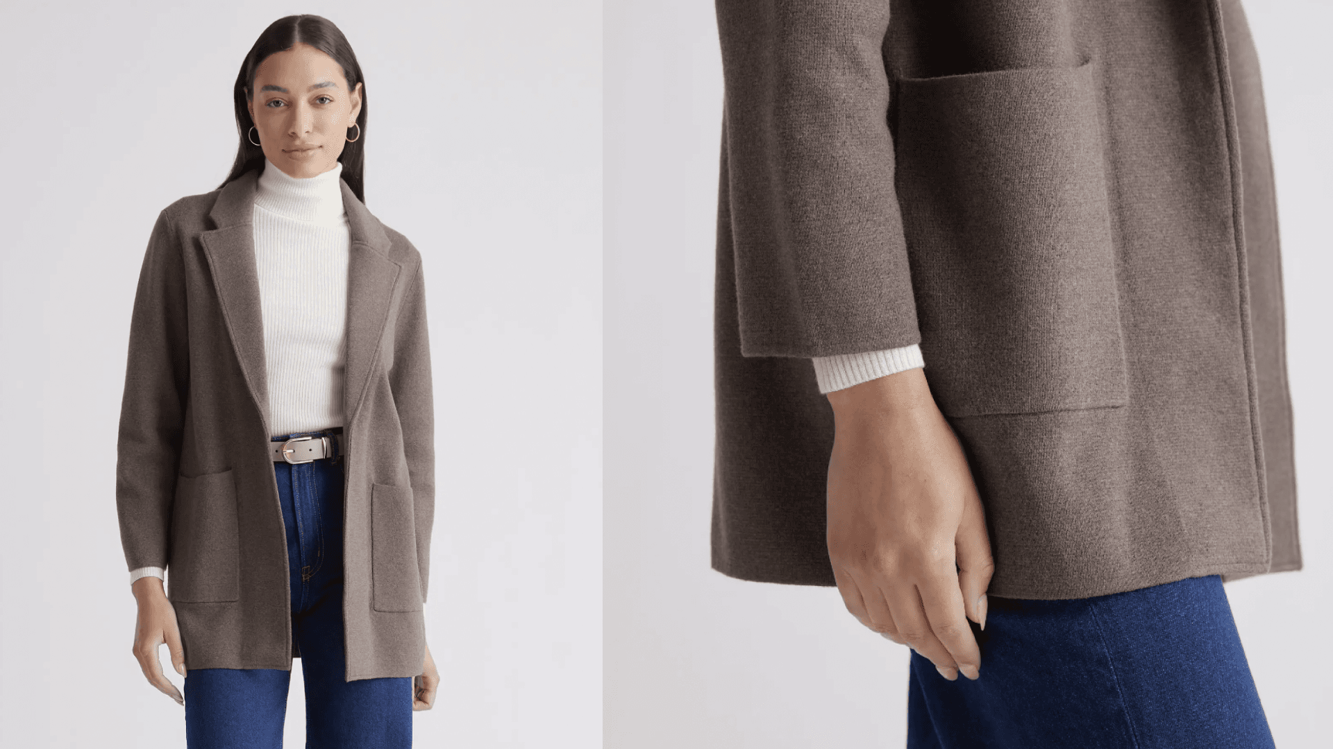 If you don’t own a sweater-jacket, you need to. They’re one of the most versatile pieces in between seasons and are softer than regular blazers. Plus, they provide additional warmth, but with a structure that’s dressed-up and elevated for the office. ($69.90, Quince)